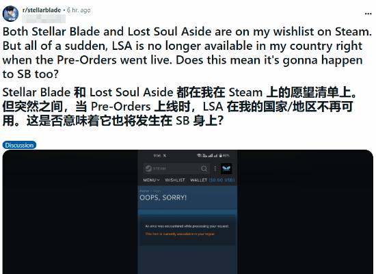 有玩家在Reddit论坛上提到了这一消息,表示《剑星》和《失落之魂》都在自己的Steam愿望清单中。然而,由于索尼对《失落之魂》实施了多个国家/地区的销售限制,他无法购买这款游戏。这让他担心,未来《剑星》发售时,是否也会面临同样的限制,从而无法购买。